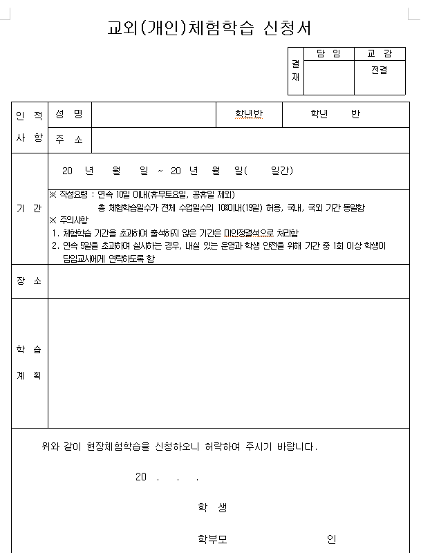 이번 글을 통해 교외체험학습 보고서 작성에 대한 이해를 높이고, 실전 작성에 도움이 되었기를 바랍니다.