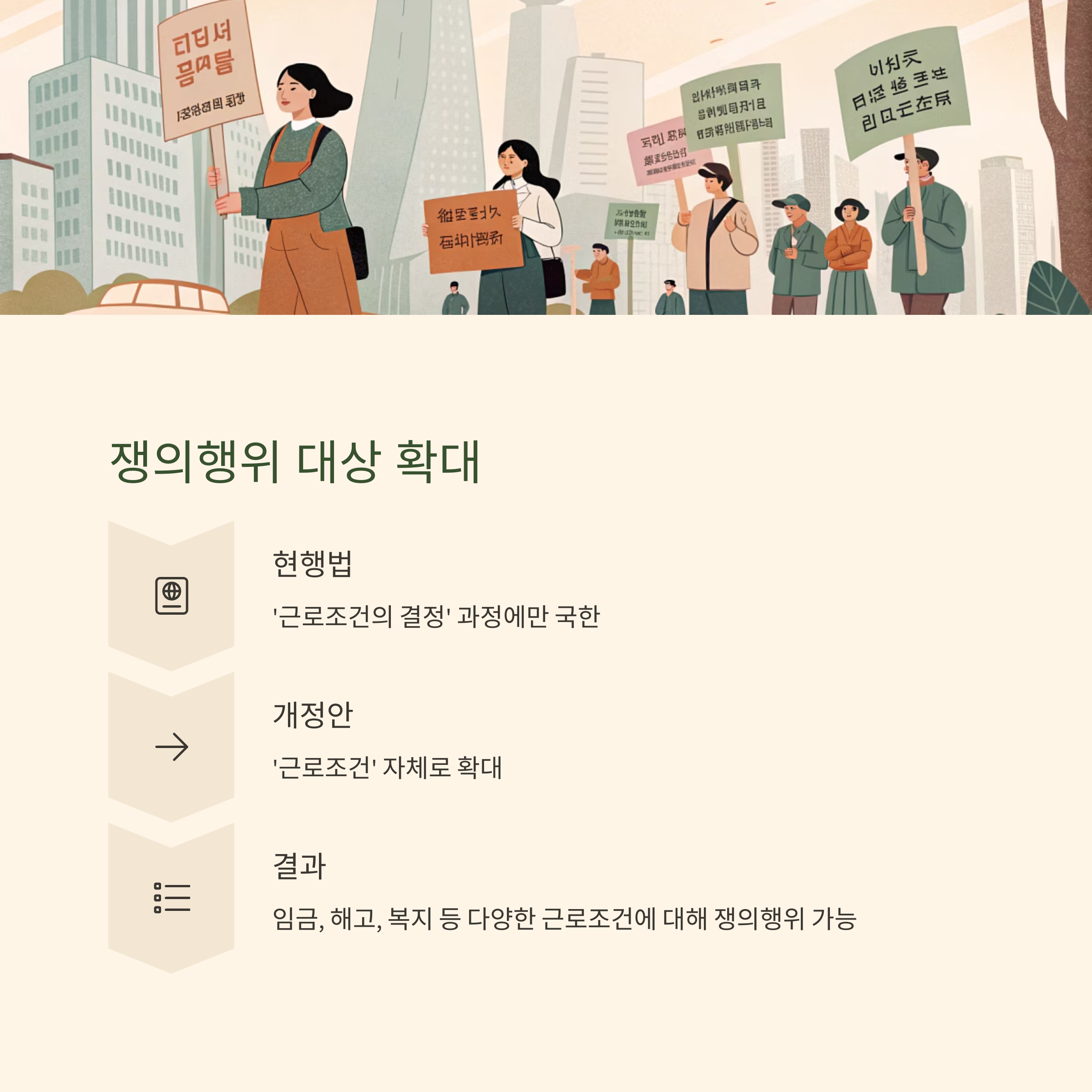 | 쟁의 주체 | 정규직 중심 | 간접·특수고용 포함 |