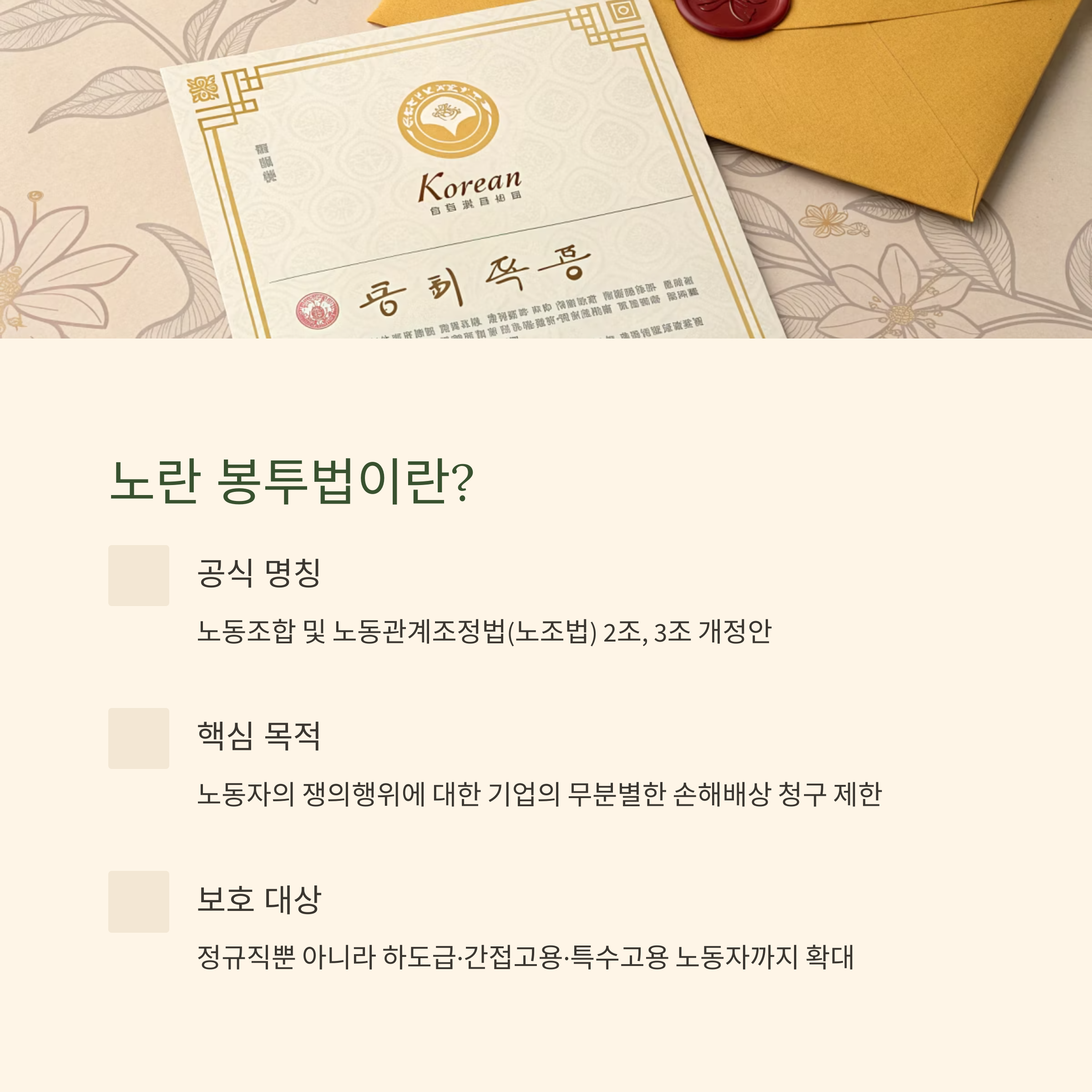 노란봉투법은 노동자의 정당한 쟁의행위를 보호하고, 하청·비정규직·특수고용 노동자의 권리를 실질적으로 강화하기 위해 마련된 법안입니다. 사용자 범위 확대와 손해배상 청구 제한이 핵심이며, 노동자와 기업 모두에게 중대한 변화가 예고됩니다.