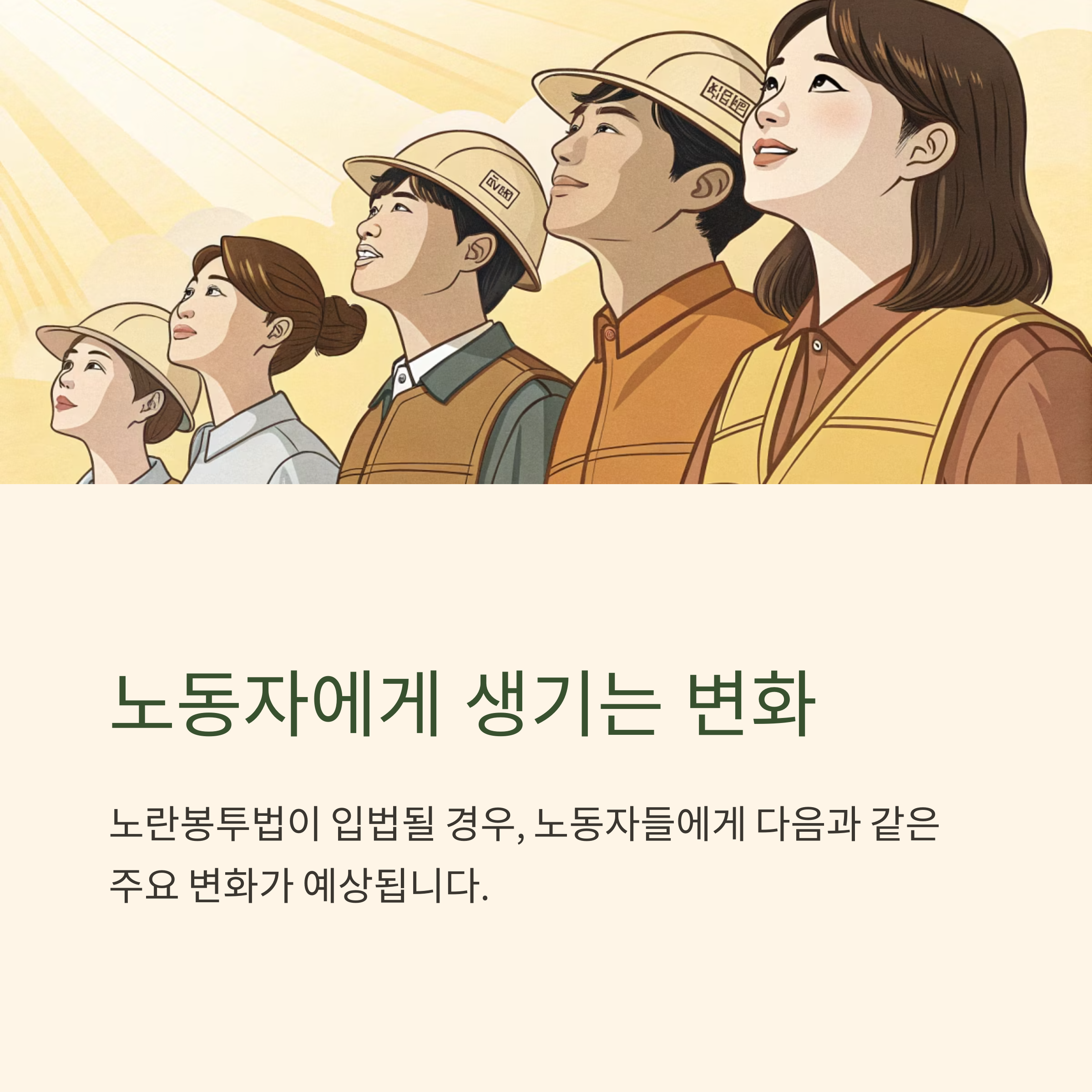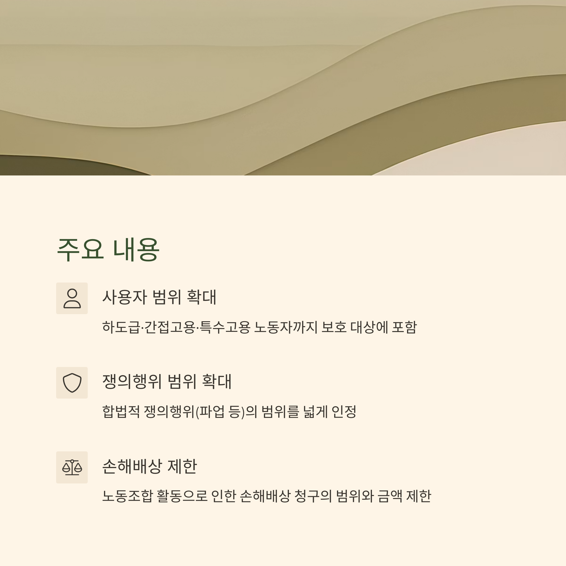 노란봉투법은 노동자의 정당한 쟁의행위를 보호하고, 하청·비정규직·특수고용 노동자의 권리를 실질적으로 강화하기 위해 마련된 법안입니다. 사용자 범위 확대와 손해배상 청구 제한이 핵심이며, 노동자와 기업 모두에게 중대한 변화가 예고됩니다.