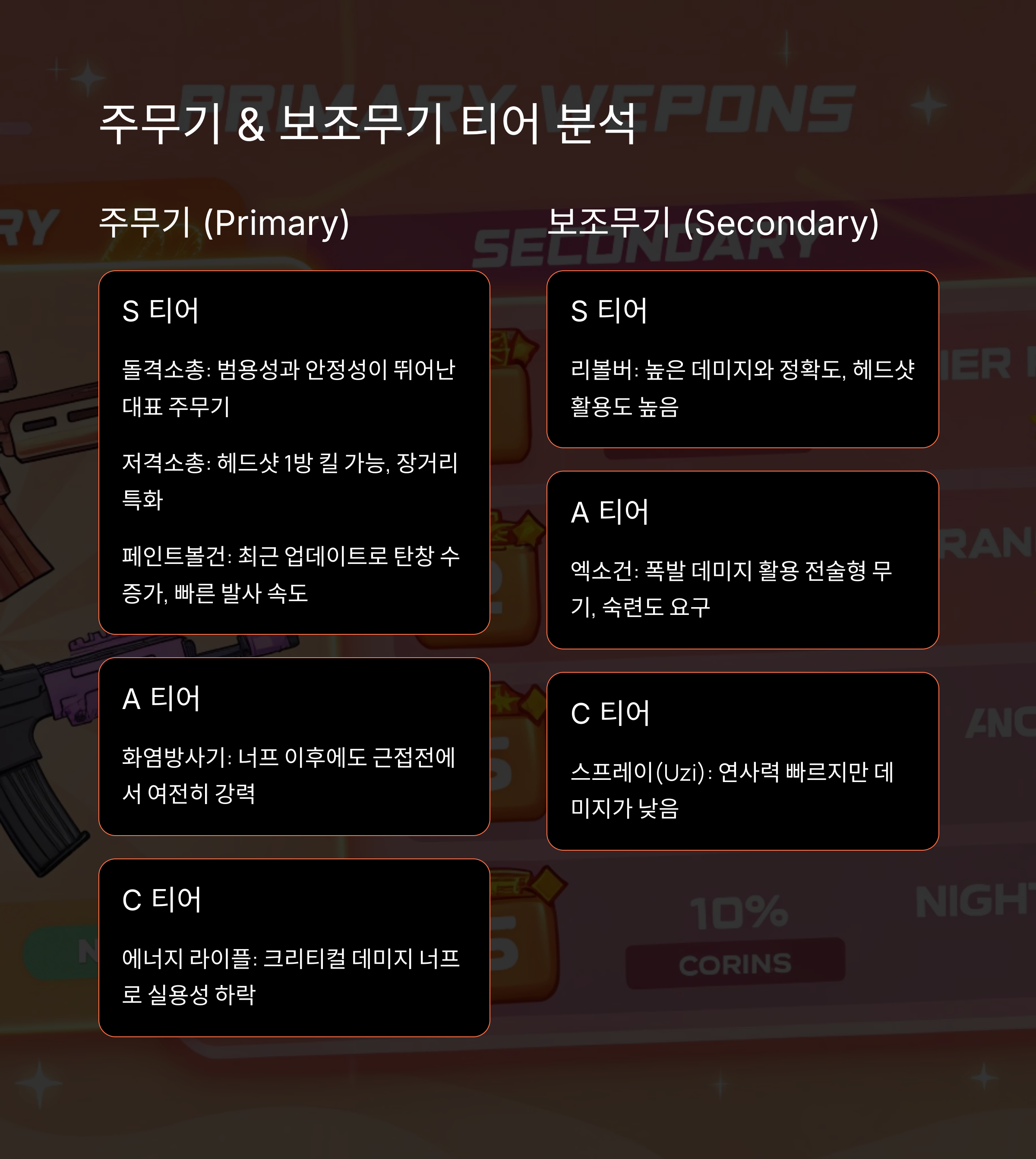 | S 티어 | 저격소총, 돌격소총, 페인트볼건, 리볼버, 카타나, 낫 |