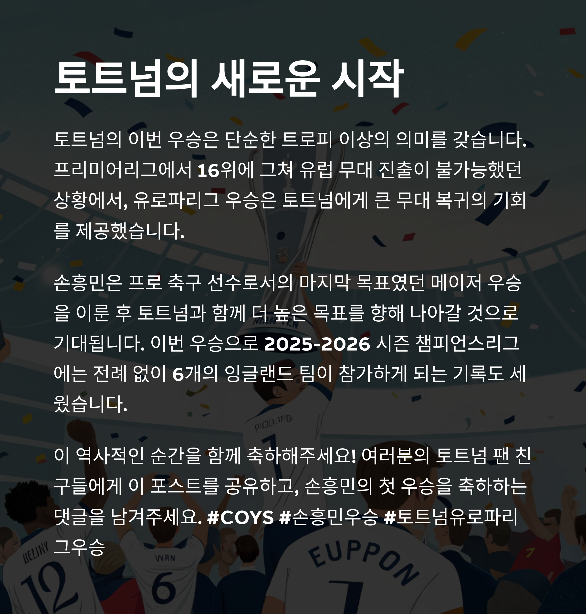 손흥민이 이끈 토트넘의 반전 드라마: 17년 만의 유럽 정상 복귀