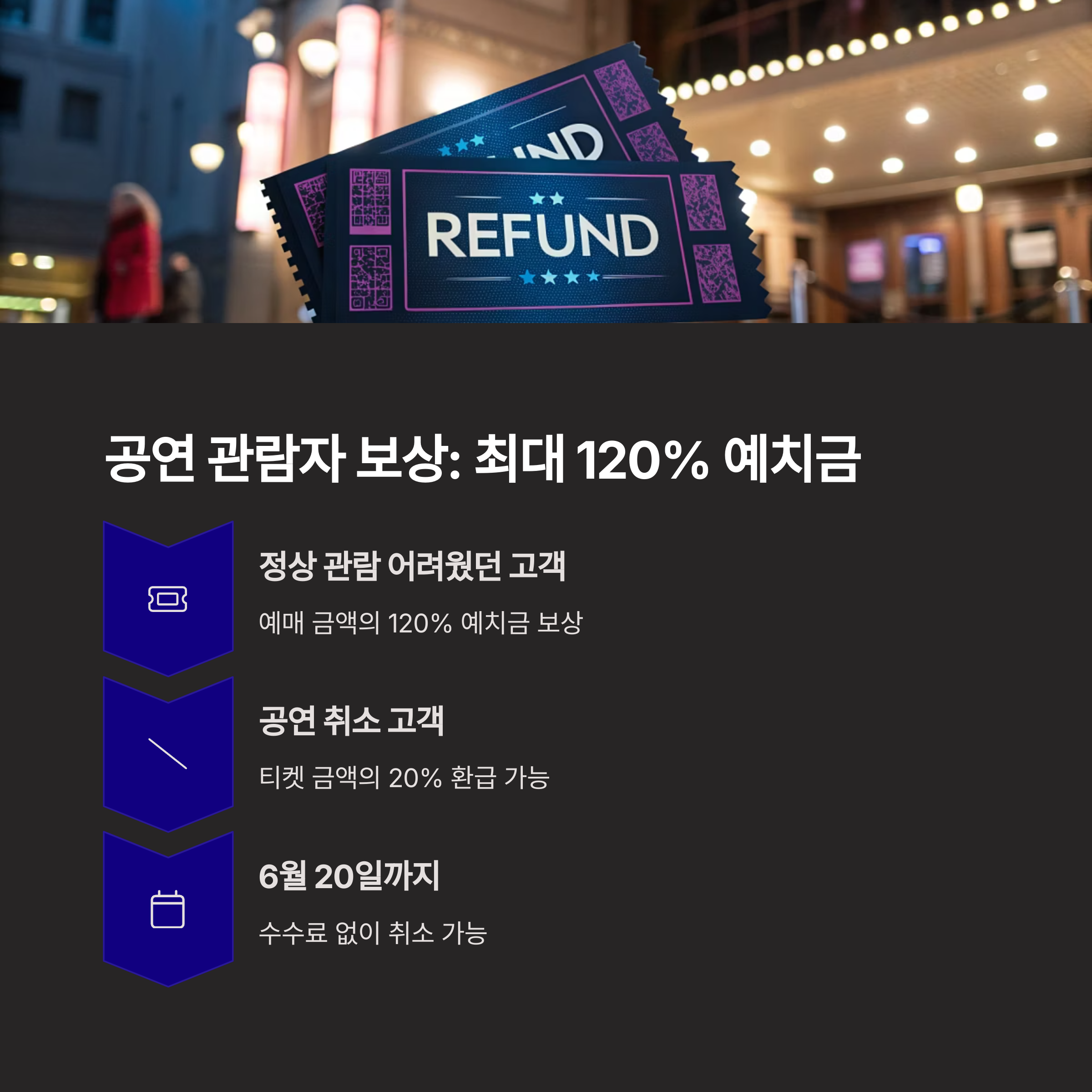 예매 금액의 120%를 예치금으로 보상합니다. 공연을 취소했던 경우도