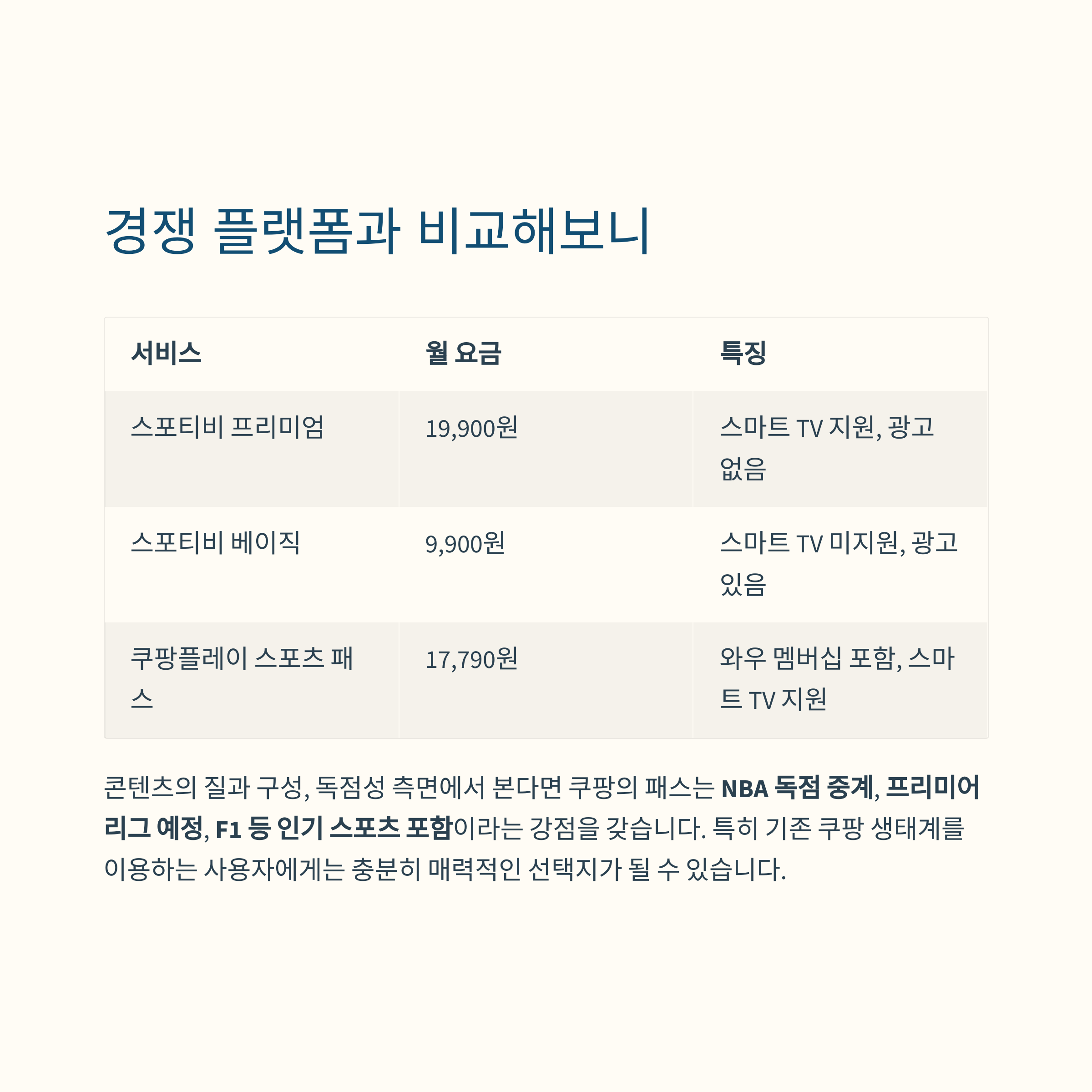 콘텐츠의 질과 구성, 독점성 측면에서 본다면 쿠팡의 패스는 NBA 독점 중계, 프리미어리그 예정, F1 등 인기 스포츠 포함이라는 강점을 갖습니다. 특히 기존 쿠팡 생태계를 이용하는 사용자에게는 충분히 매력적인 선택지가 될 수 있습니다.