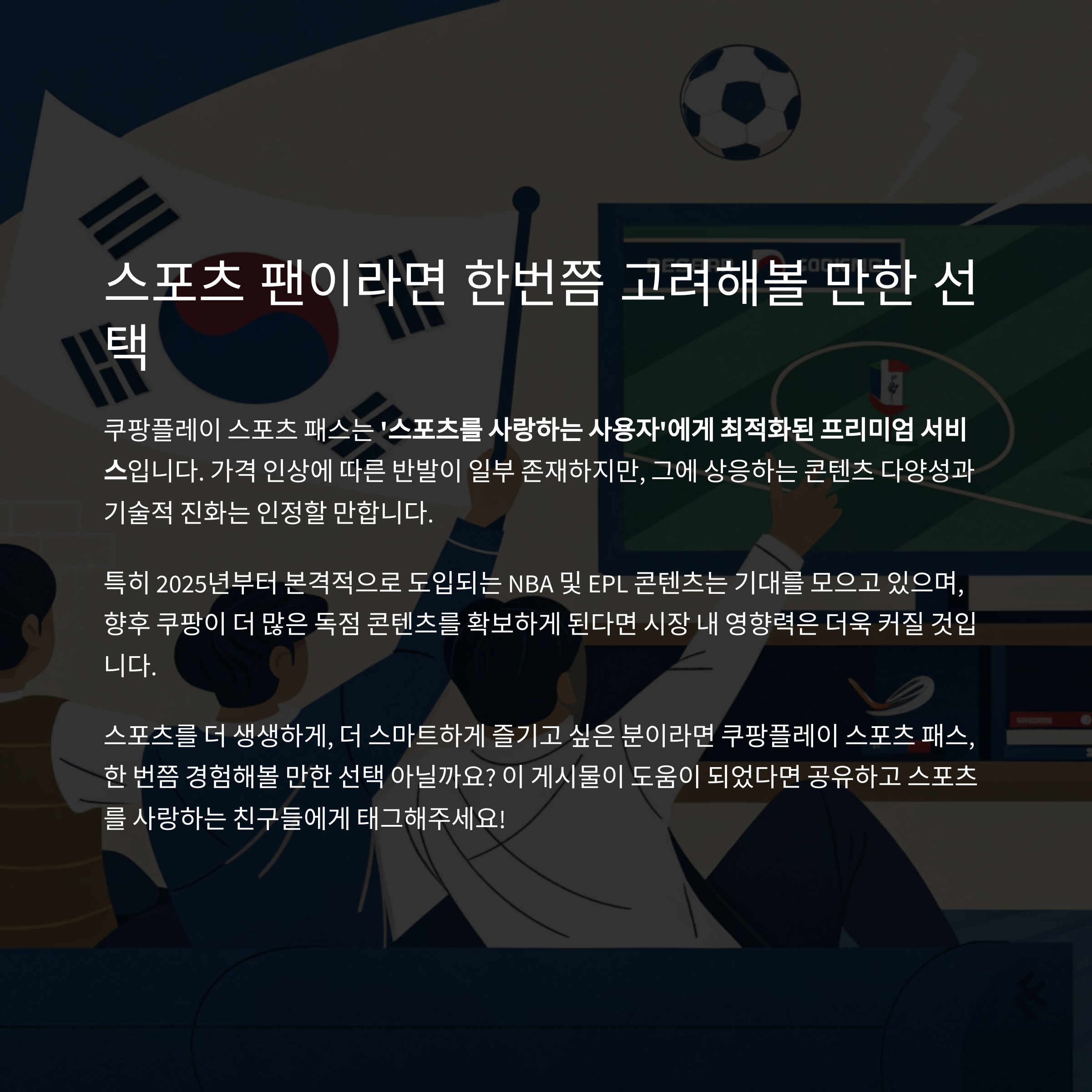 결국 쿠팡플레이 스포츠 패스는 '스포츠를 사랑하는 사용자'에게 최적화된 프리미엄 서비스입니다. 가격 인상에 따른 반발이 일부 존재하지만, 그에 상응하는 콘텐츠 다양성과 기술적 진화는 인정할 만합니다. 특히 2025년부터 본격적으로 도입되는 NBA 및 EPL 콘텐츠는 기대를 모으고 있으며, 향후 쿠팡이 더 많은 독점 콘텐츠를 확보하게 된다면 시장 내 영향력은 더욱 커질 것입니다.