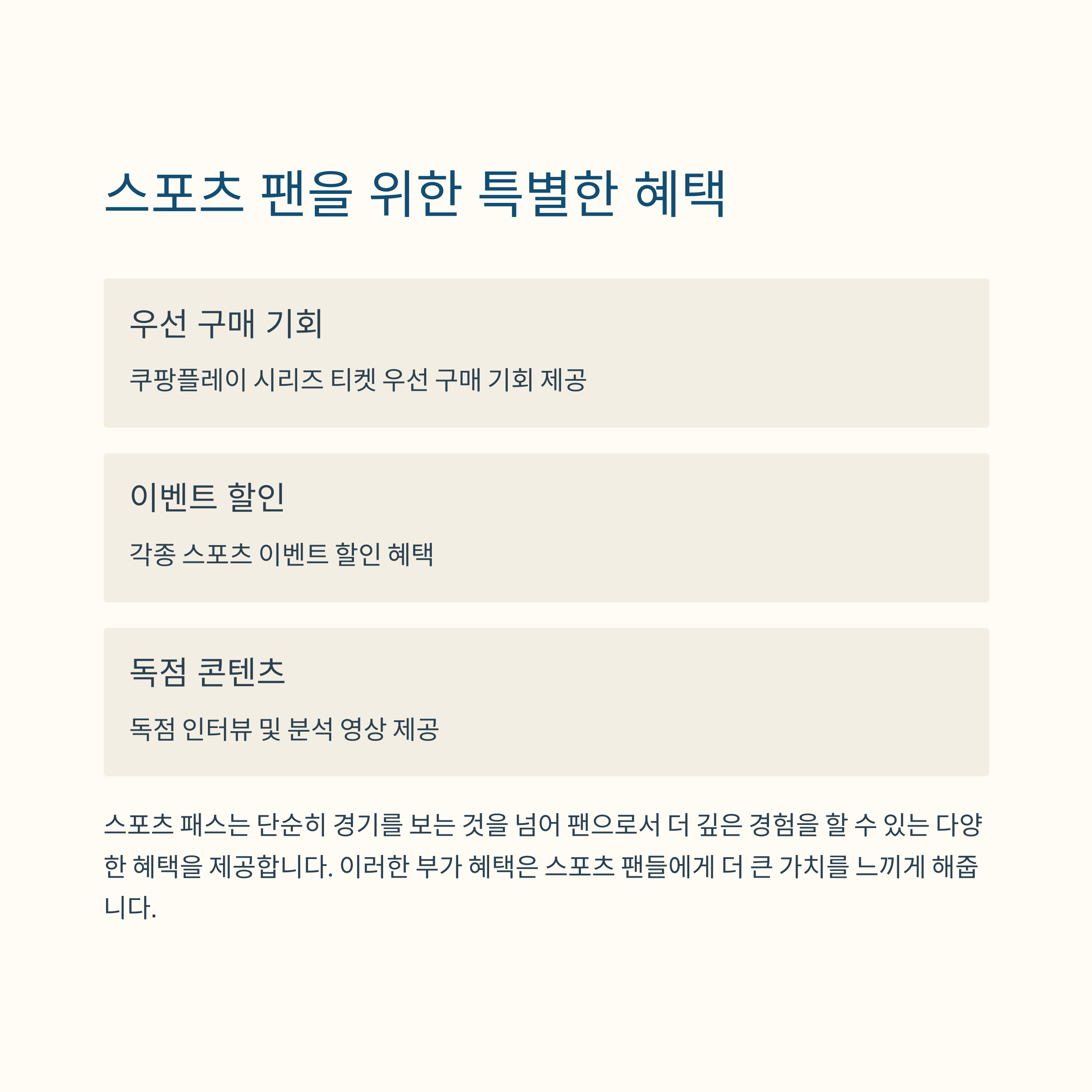 이뿐만 아니라 쿠팡플레이 스포츠 패스 가입자는 쿠팡플레이 시리즈 티켓 우선 구매 기회, 각종 스포츠 이벤트 할인, 독점 인터뷰 및 분석 영상 제공 등의 부가 혜택도 누릴 수 있습니다. 스포츠 콘텐츠를 단순 소비하는 것을 넘어, 팬과의 접점을 강화하는 전략이 돋보입니다.