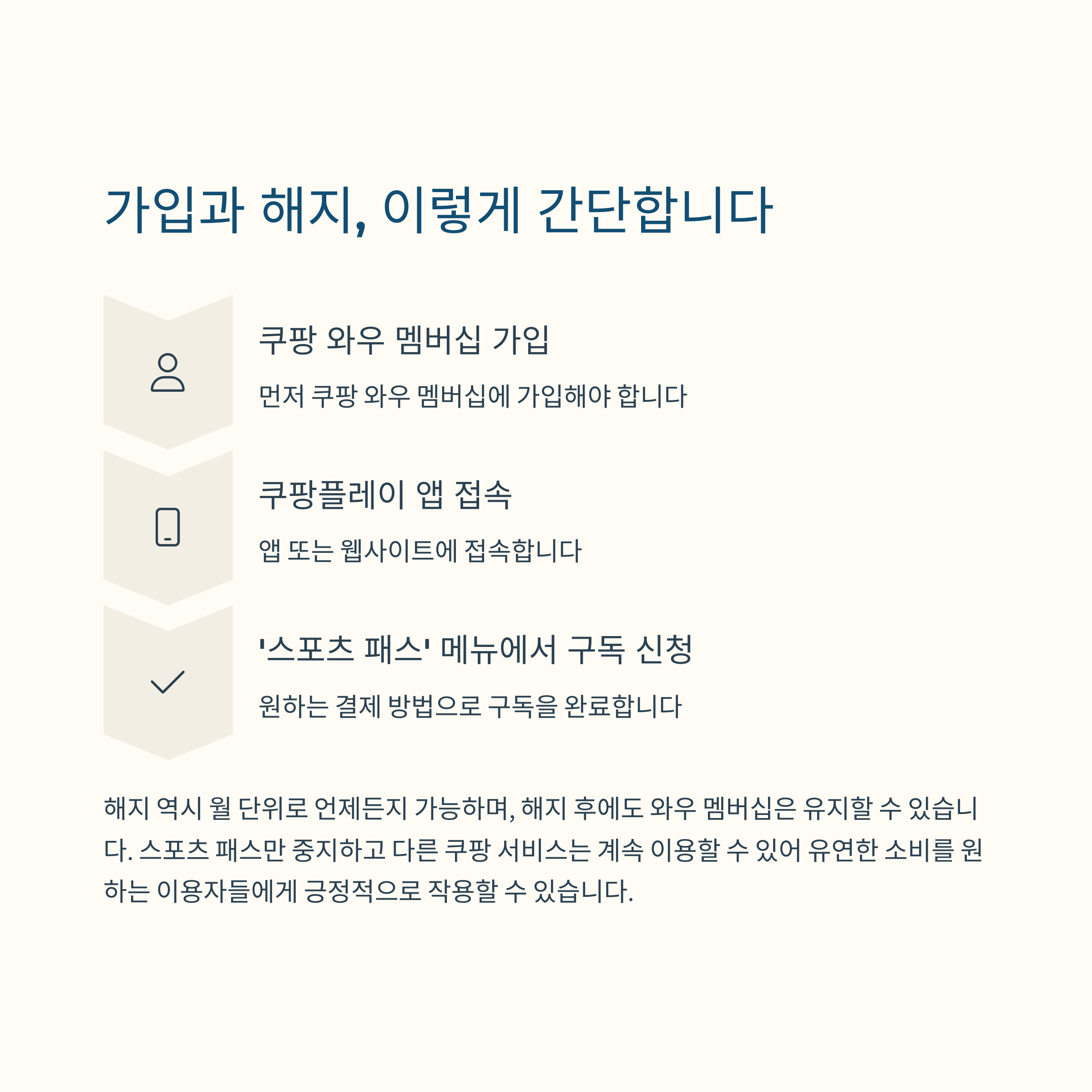 스포츠 패스는 단독으로는 가입이 불가능하며, 반드시 쿠팡 와우 멤버십에 가입된 상태여야 추가로 구독할 수 있습니다. 이 구조는 사용자가 원하든 원하지 않든 기본적으로 와우 서비스(빠른 배송, 무료 반품, 쿠팡캐시 적립 등)를 사용하게 만듭니다.