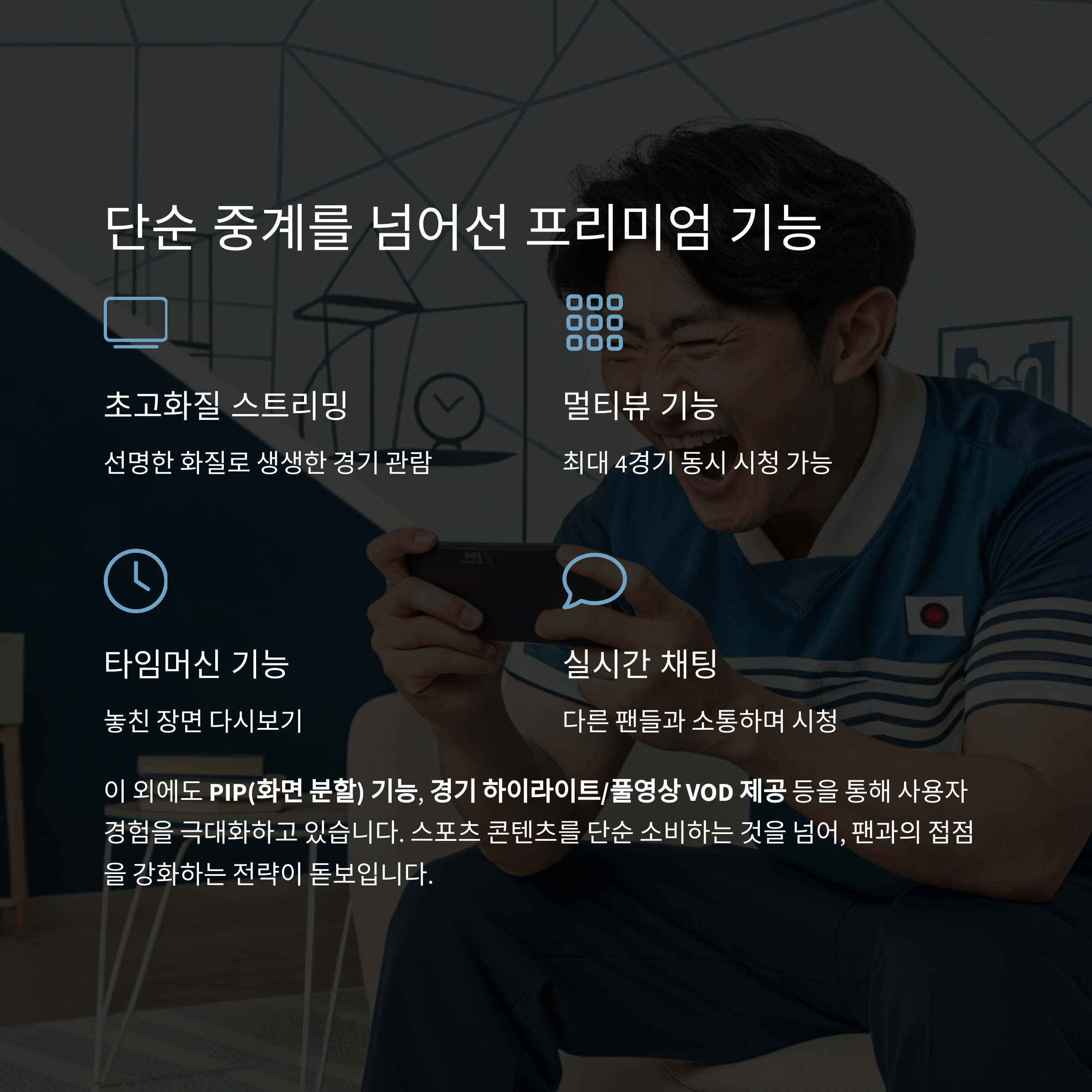 단순히 중계만 제공하는 것이 아닙니다. 스포츠 패스는 이용자들이 보다 편리하고 즐겁게 경기를 시청할 수 있도록 다양한 기능을 도입했습니다. 예를 들어, 초고화질 스트리밍, 멀티뷰 기능(최대 4경기 동시 시청 예정), 타임머신 기능, PIP(화면 분할) 기능, 실시간 채팅, 경기 하이라이트/풀영상 VOD 제공 등의 기능을 통해 사용자 경험을 극대화하고 있습니다.