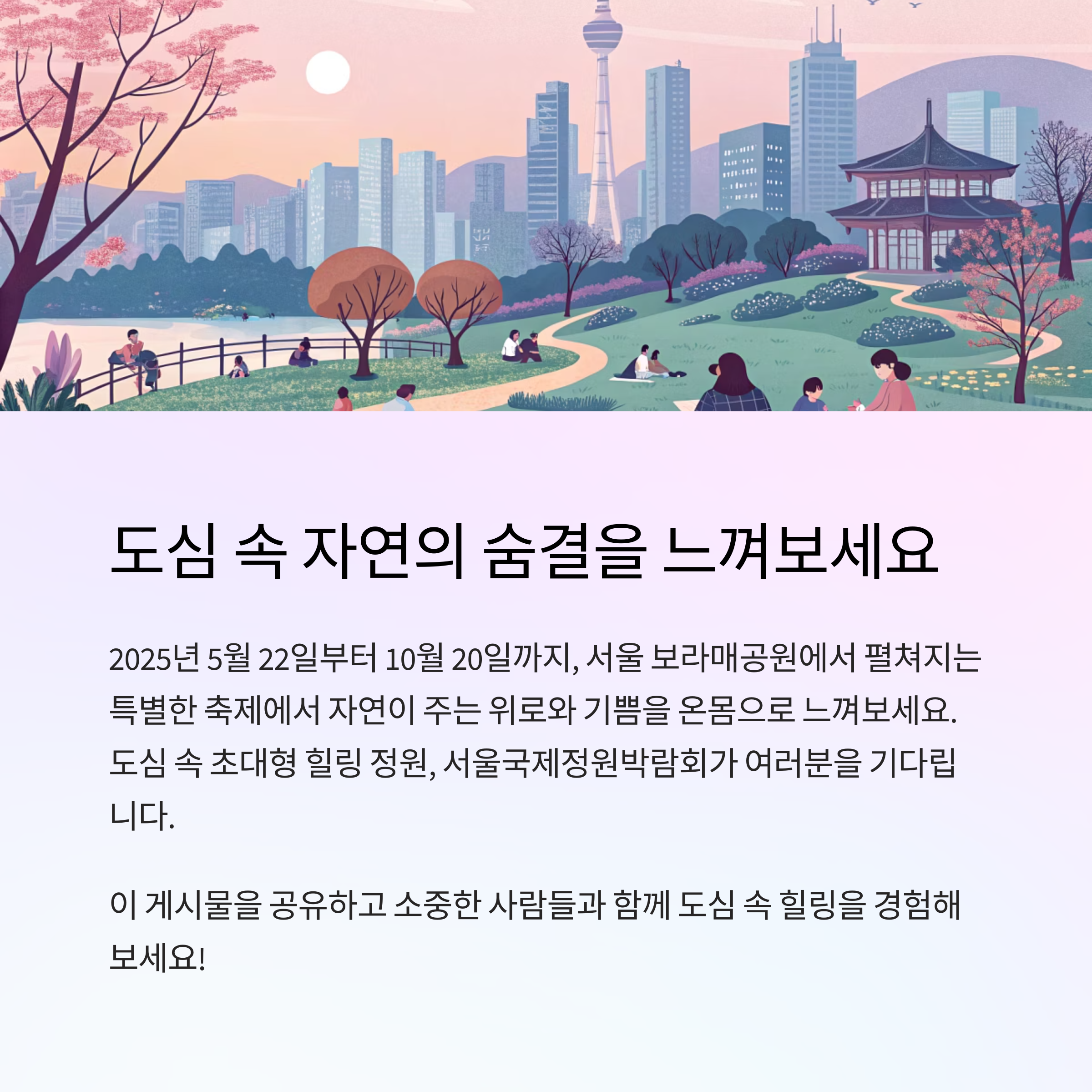 서울국제정원박람회는 단순한 전시를 넘어, 시민 모두가 자연과 교감하고 문화를 체험하는 특별한 공간으로 거듭나고 있습니다. 가족, 연인, 친구 누구와 함께해도 좋을 이 박람회, 올해는 보라매공원에서 더욱 확장된 모습으로 만날 수 있습니다. 지금 바로 일정 체크하고, 잊지 못할 가든 라이프스타일을 경험하세요!