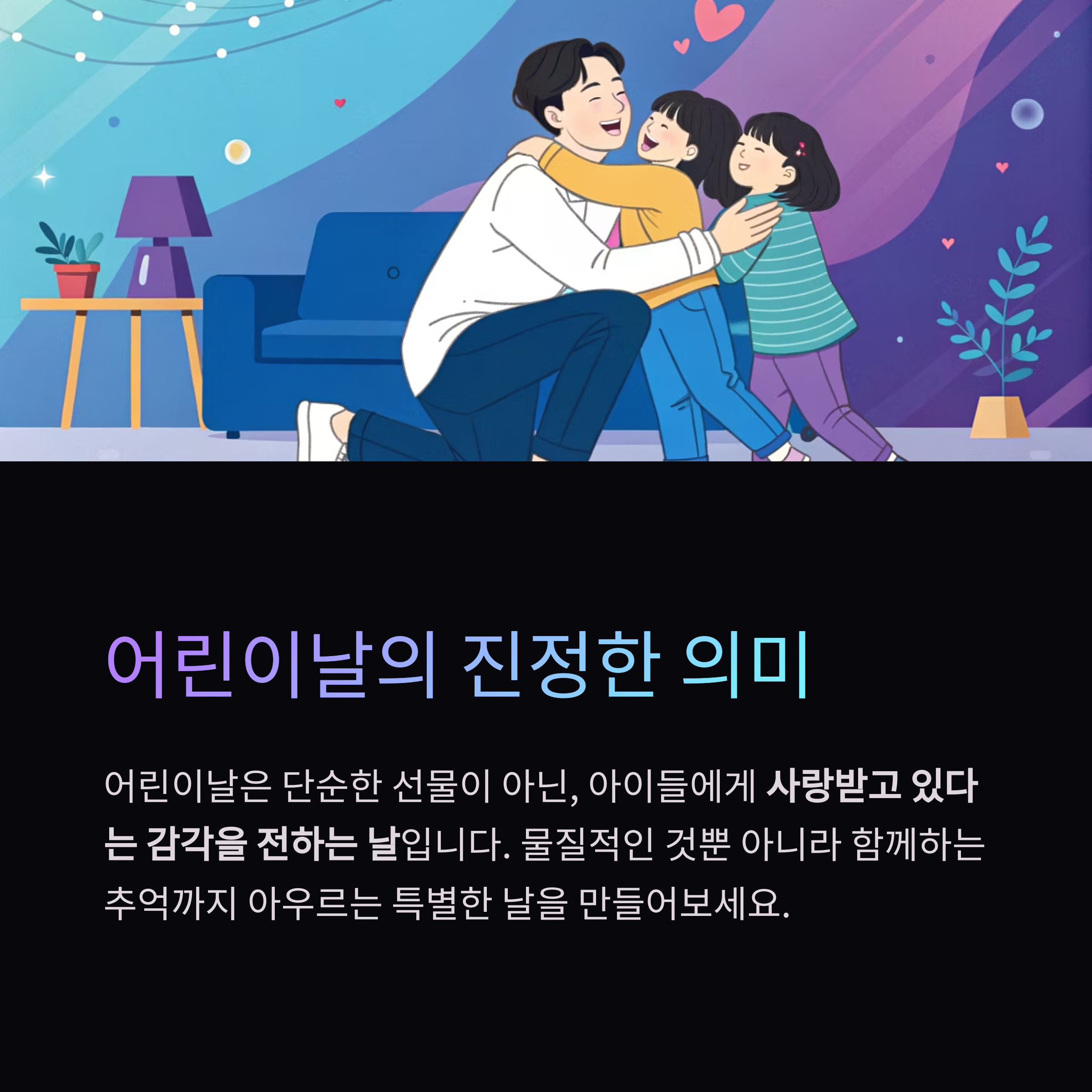 어린이날은 단순히 선물을 주는 날이 아니라, 아이들에게 사랑받고 있다는 감각을 전하는 날입니다. 이번 글에서는 2025년 어린이날을 맞아 연령별, 가격대별, 최신 트렌드별로 아이들의 마음을 사로잡을 선물 아이디어를 정리했습니다. 물질적인 것뿐 아니라 함께하는 추억까지 아우르는 이 가이드를 통해, 올해는 아이에게 더욱 특별한 웃음을 선물해보세요.