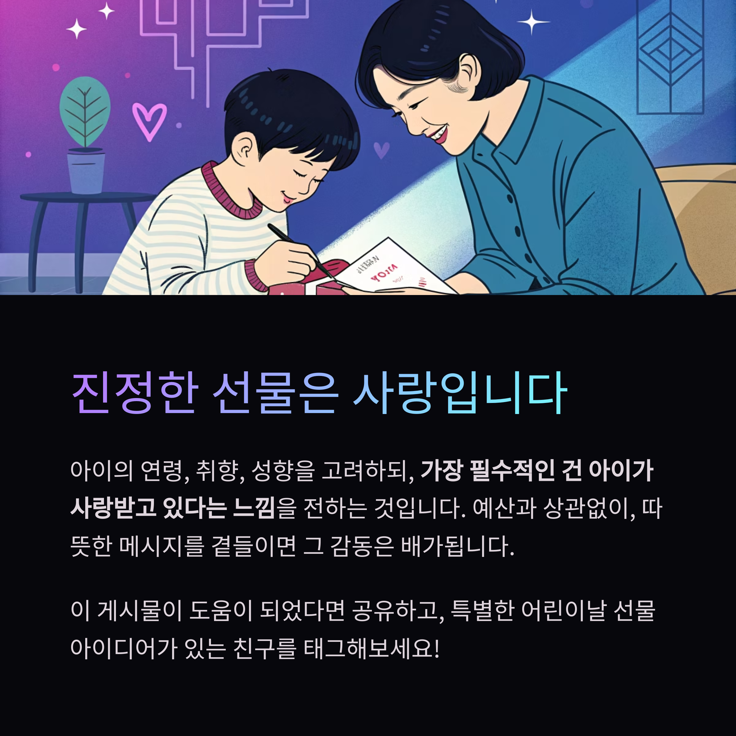 아이의 연령, 취향, 성향, 실내·실외 활동 구분, 지속 가능성, 안전성까지 모두 고려해야 최적의 선물을 고를 수 있습니다. 가장 필수적인 건, 아이가 사랑받고 있다는 느낌을 받도록 하는 것입니다. 예산과 상관없이, 손편지나 따뜻한 메시지를 곁들여 주는 것만으로도 그 감동은 배가됩니다.