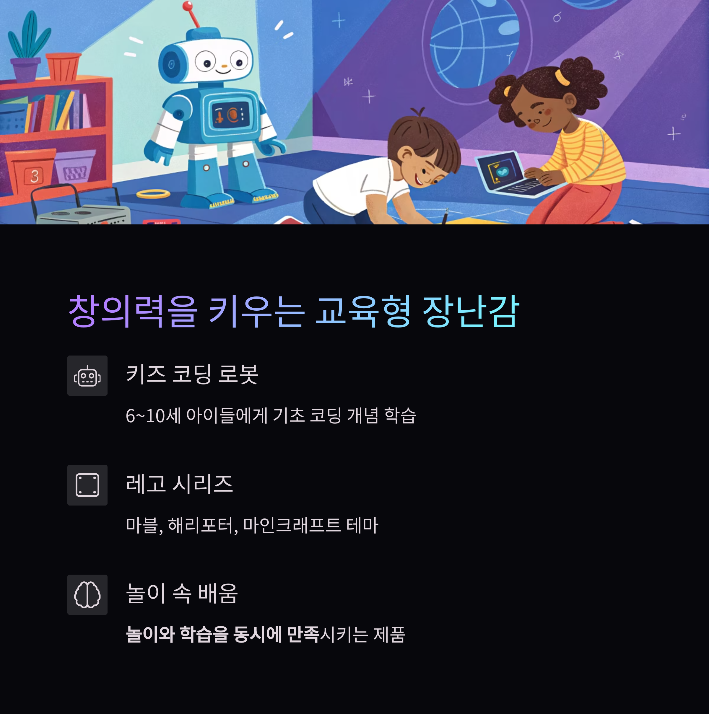 디지털 기기 사용이 늘어나면서 놀이와 학습을 동시에 만족시키는 제품들이 각광받고 있습니다. 키즈 코딩 로봇은 6~10세 아이들에게 기초 코딩 개념을 자연스럽게 익히게 해주며, 레고 마블·해리포터·마인크래프트 시리즈는 창의력 발달에 큰 도움을 줍니다. 중요한 건 아이가 놀이 속에서 배움의 즐거움을 느끼도록 도와주는 것입니다.