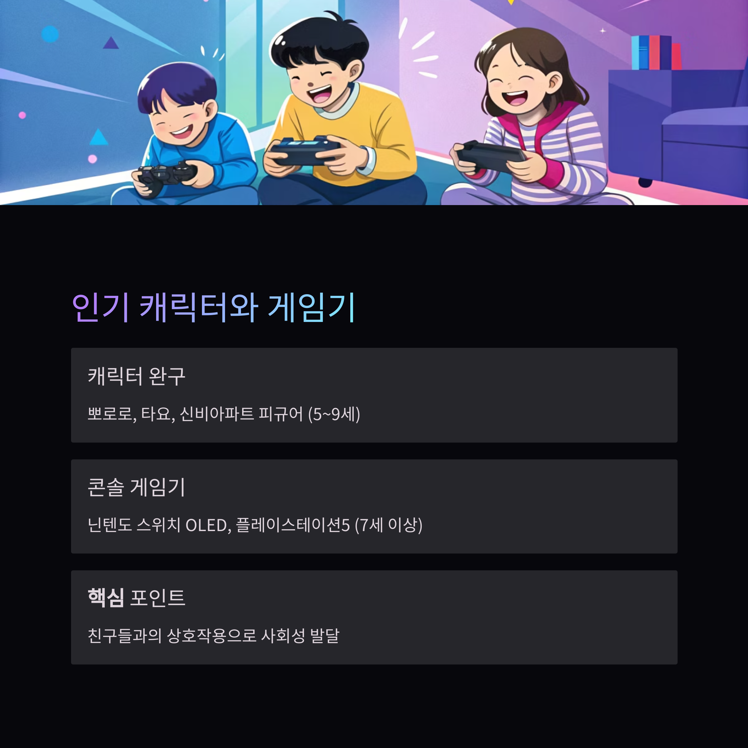 캐릭터 완구는 여전히 5~9세 아이들에게 인기가 많습니다. 뽀로로, 타요, 신비아파트 피규어나 인형은 친숙함과 재미를 동시에 줍니다. 7세 이상 아이들에게는 닌텐도 스위치 OLED, 플레이스테이션5 같은 콘솔 게임기가 큰 관심을 받습니다. 친구들과의 상호작용을 통해 사회성을 키우는 데도 도움이 된다는 점이 핵심입니다.