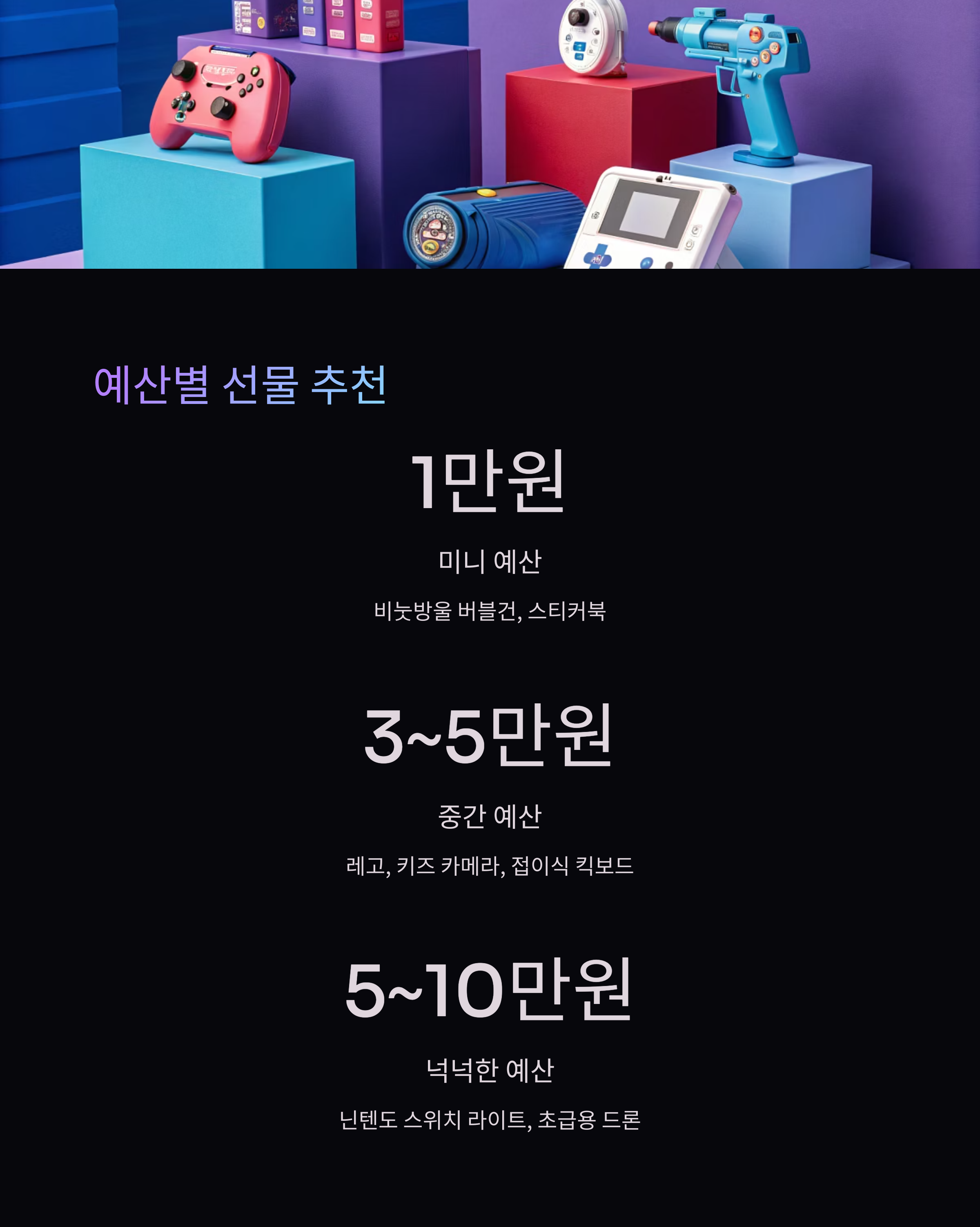 모든 가정의 예산은 다릅니다. 1만원 이하 선물로는 비눗방울 버블건, 스티커북이 좋고, 10만원대에서는 닌텐도 스위치 라이트, 초급용 드론 같은 기술 제품이 추천됩니다.