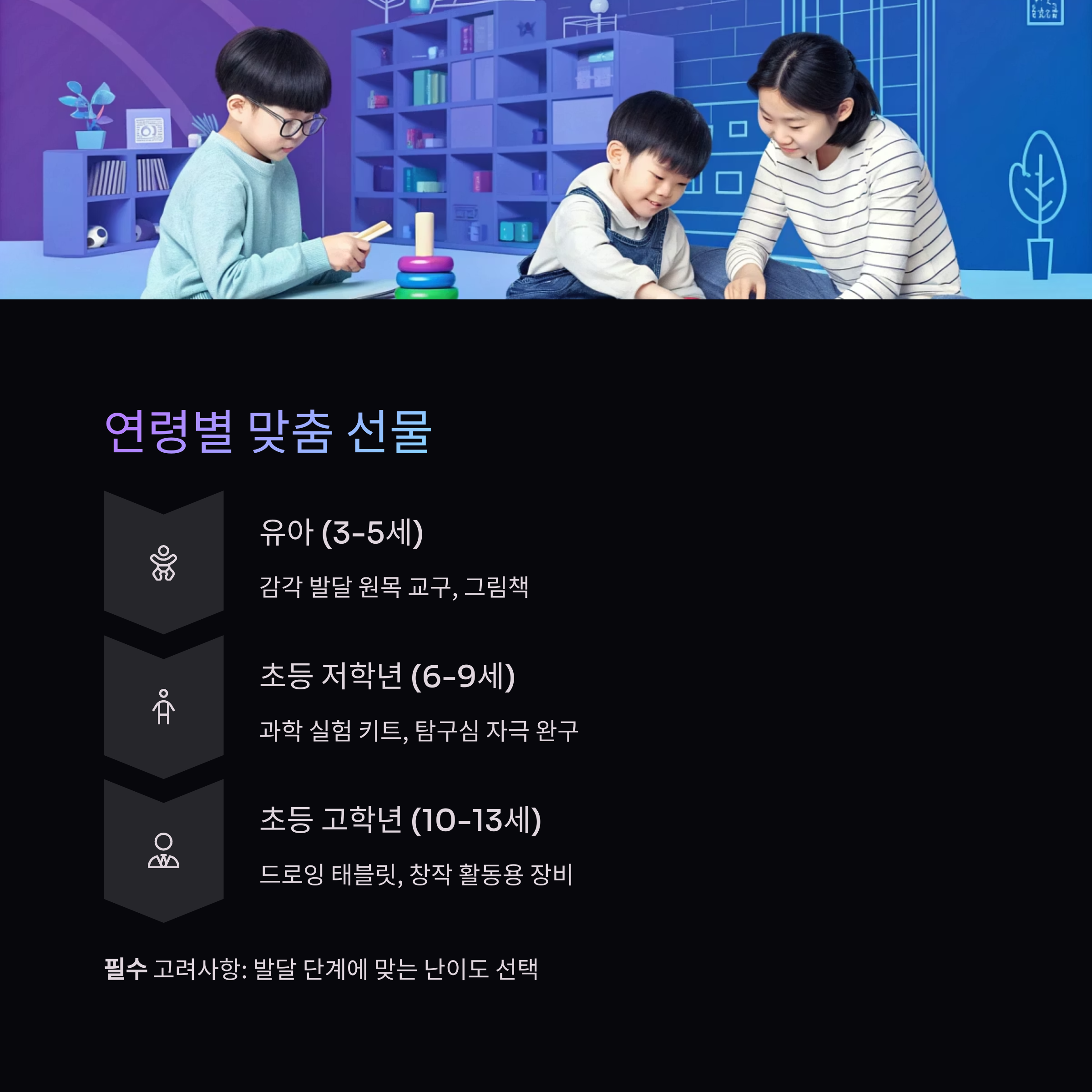 유아에게는 탐구심을 자극하는 과학 실험 키트, 초등 고학년(10~13세)에게는 드로잉 태블릿, 창작 활동용 장비가 적합합니다. 필수 고려사항은 연령과 발달 단계에 맞는 난이도 선택입니다.