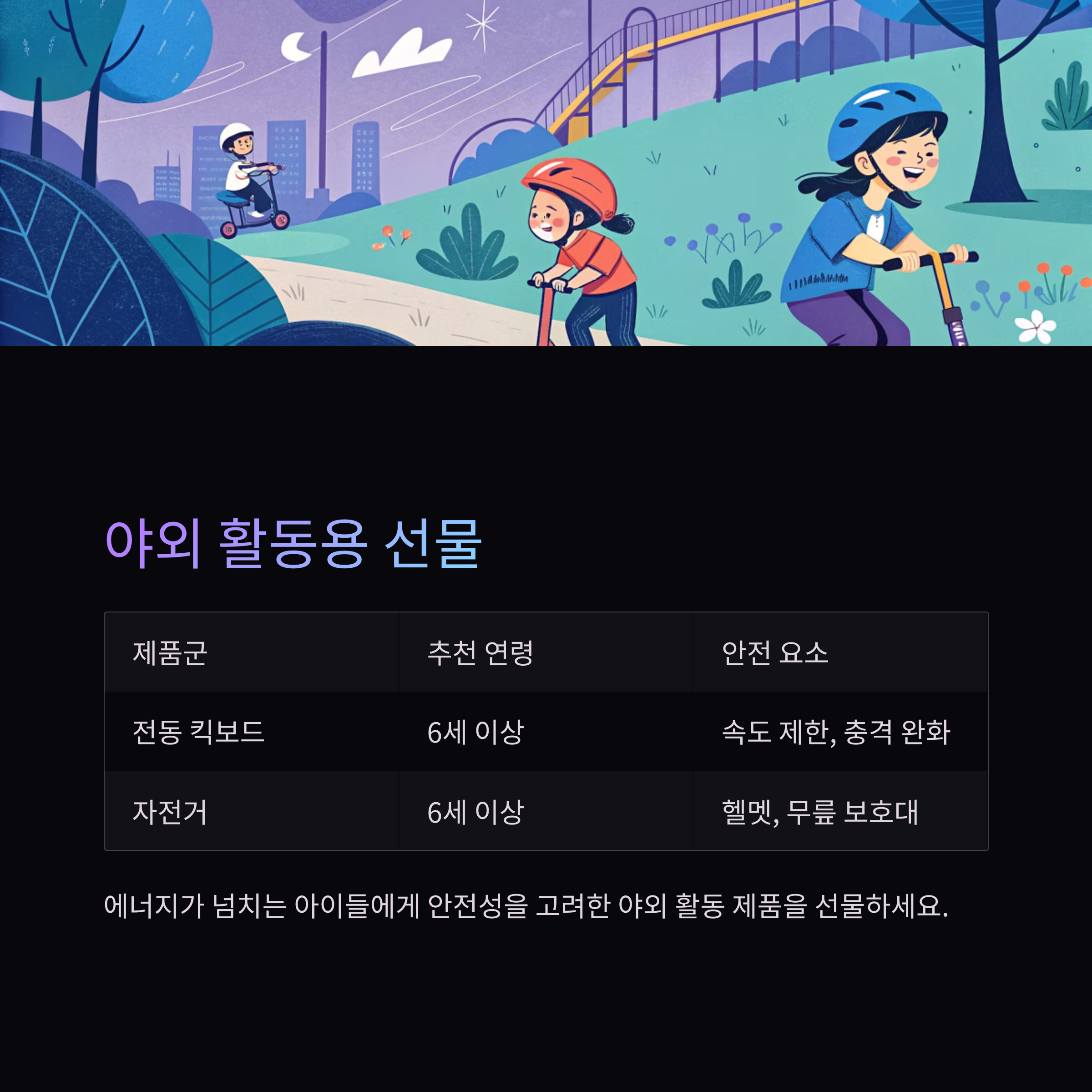 에너지가 넘치는 6세 이상 아이들에게는 전동 킥보드나 자전거가 큰 인기를 끕니다. 특히 안전 헬멧과 보호대까지 함께 선물하면 부모님의 마음까지 놓이게 됩니다. 핵심은 안전성을 고려한 제품 선택입니다.