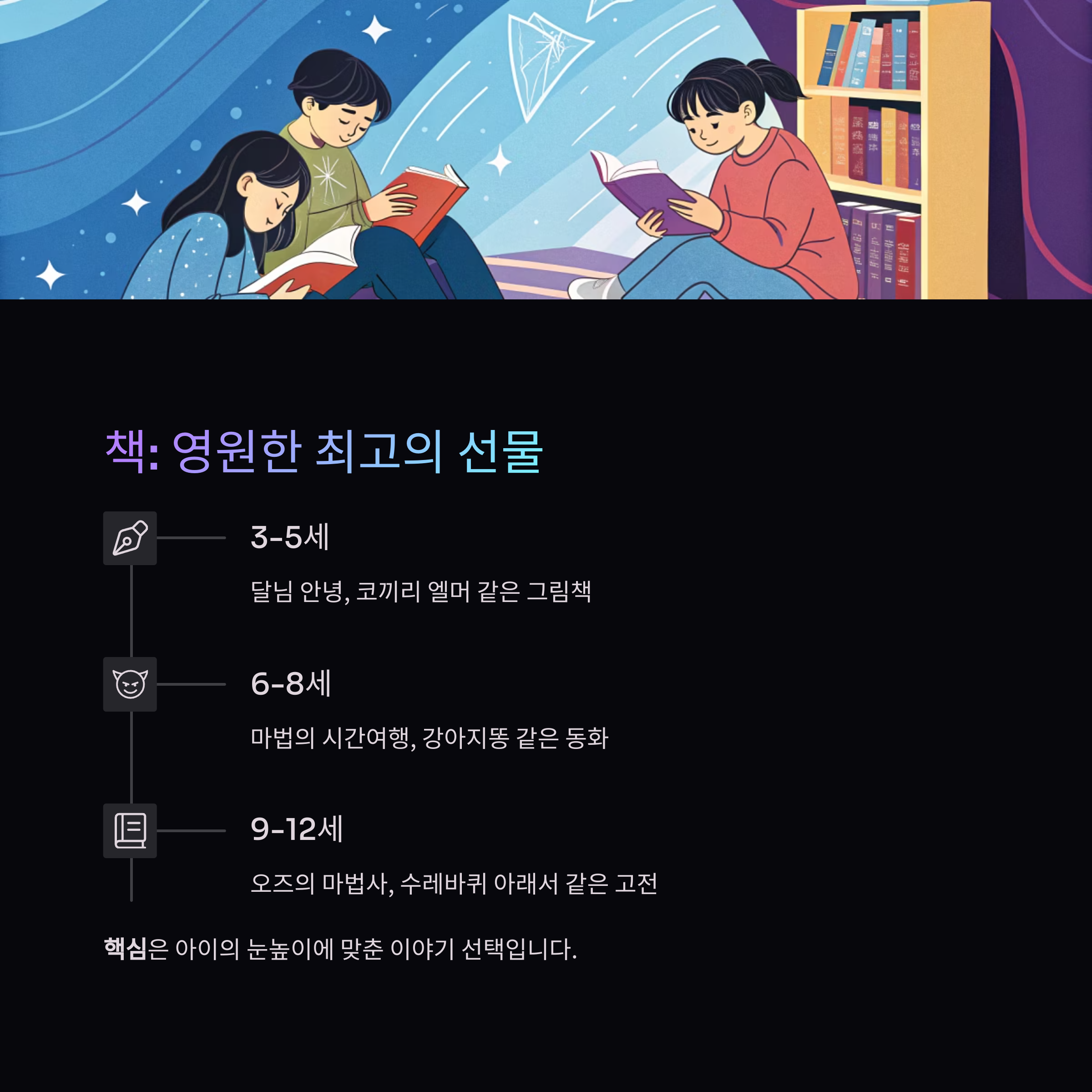 책은 언제나 좋은 선물입니다. 8세에게는 마법의 시간여행, 강아지똥 같은 동화, 9~12세에게는 오즈의 마법사, 수레바퀴 아래서 같은 고전이 추천됩니다. 핵심은 아이의 눈높이에 맞춘 이야기 선택입니다.