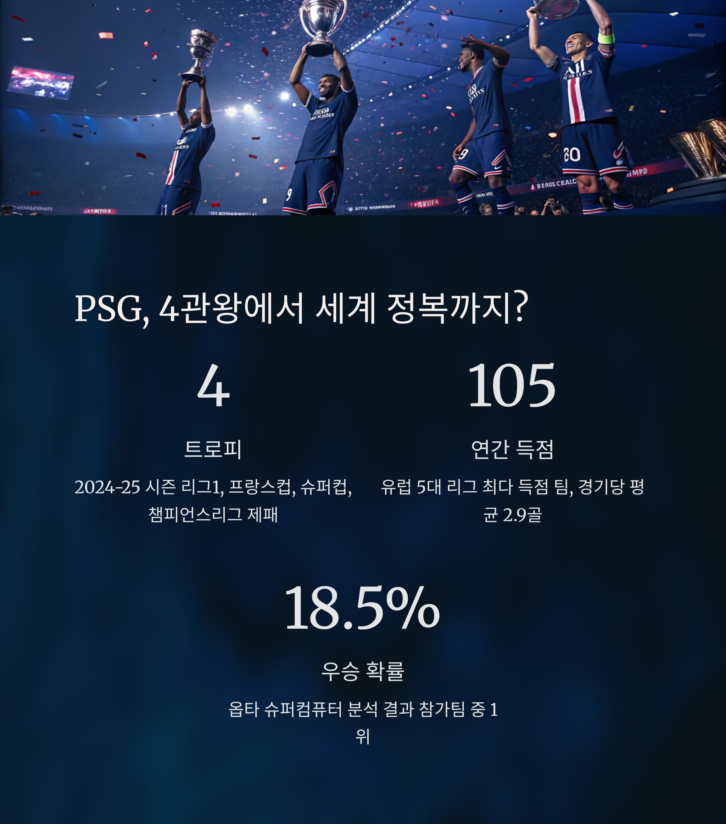 PSG는 이미 2024-25 시즌에 프랑스 리그1, 프랑스컵, 슈퍼컵, UEFA 챔피언스리그까지 모두 제패하며 4관왕을 달성한 팀입니다. 특히 챔피언스리그 결승에서는 인터 밀란을 5-0으로 완파하며 전 유럽을 압도하는 전력을 입증했습니다.