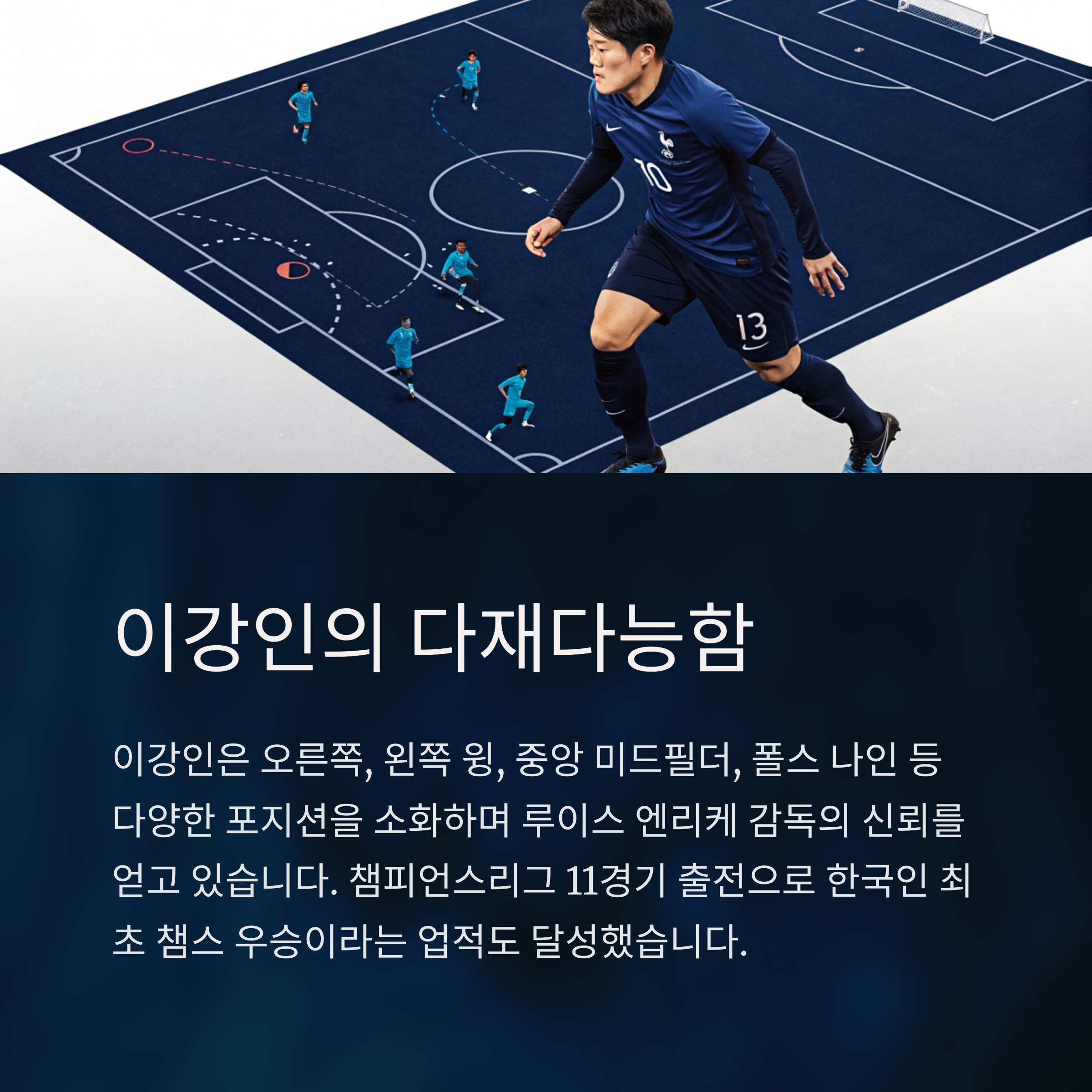 특히 이강인은 오른쪽, 왼쪽 윙, 중앙 미드필더, 폴스 나인 등 다양한 포지션을 소화하며 루이스 엔리케 감독의 신뢰를 얻고 있습니다. 챔피언스리그에서도 11경기 출전하며 중원에서 조율자로 활약했고, 한국인 최초 챔스 우승이라는 상징적 업적도 쌓았습니다.