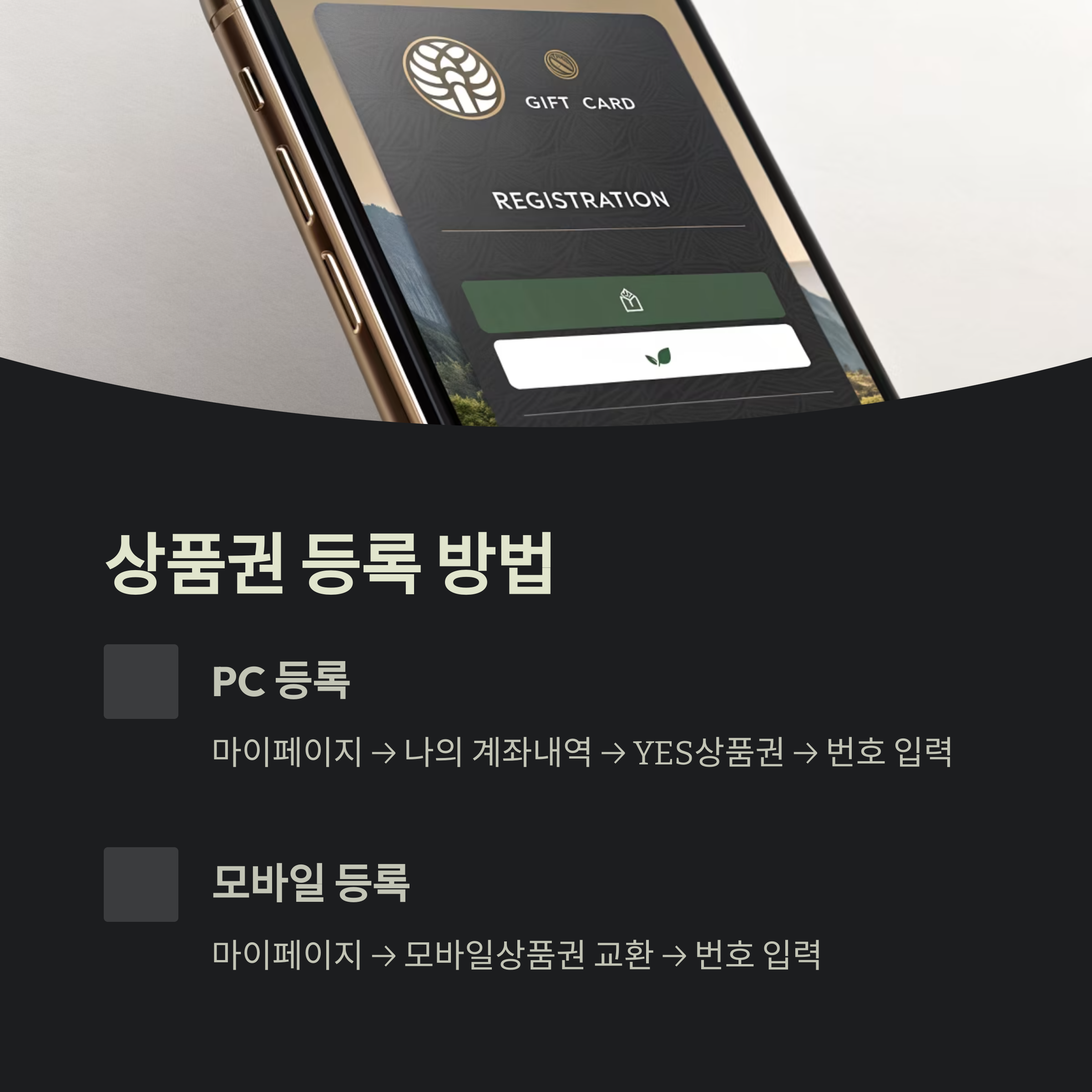 | PC | 마이페이지 → 나의 계좌내역 → YES상품권 → 번호 입력 |