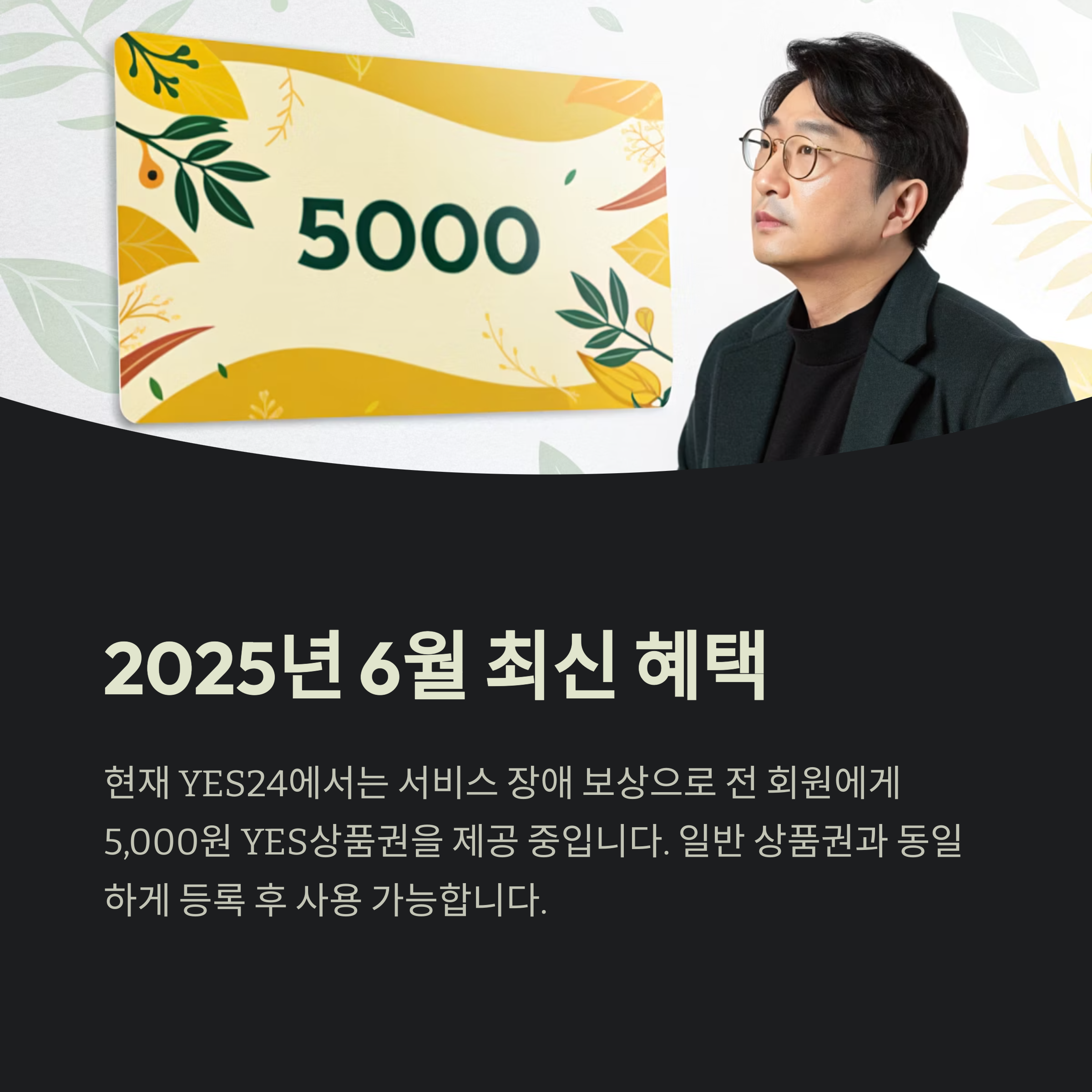 현재 YES24에서는 서비스 장애 보상의 일환으로 전 회원에게 5,000원 권의 YES상품권을 제공 중입니다.